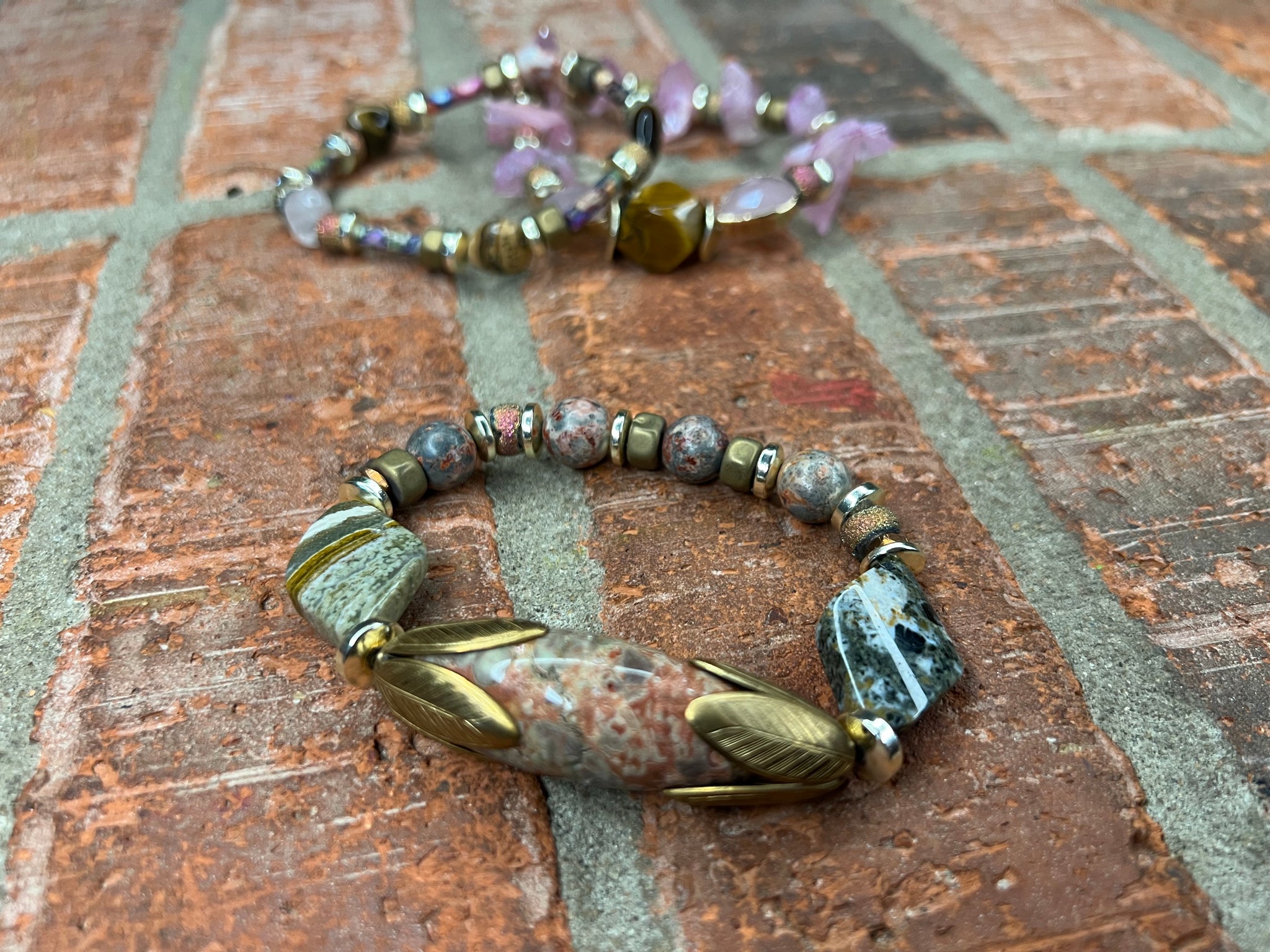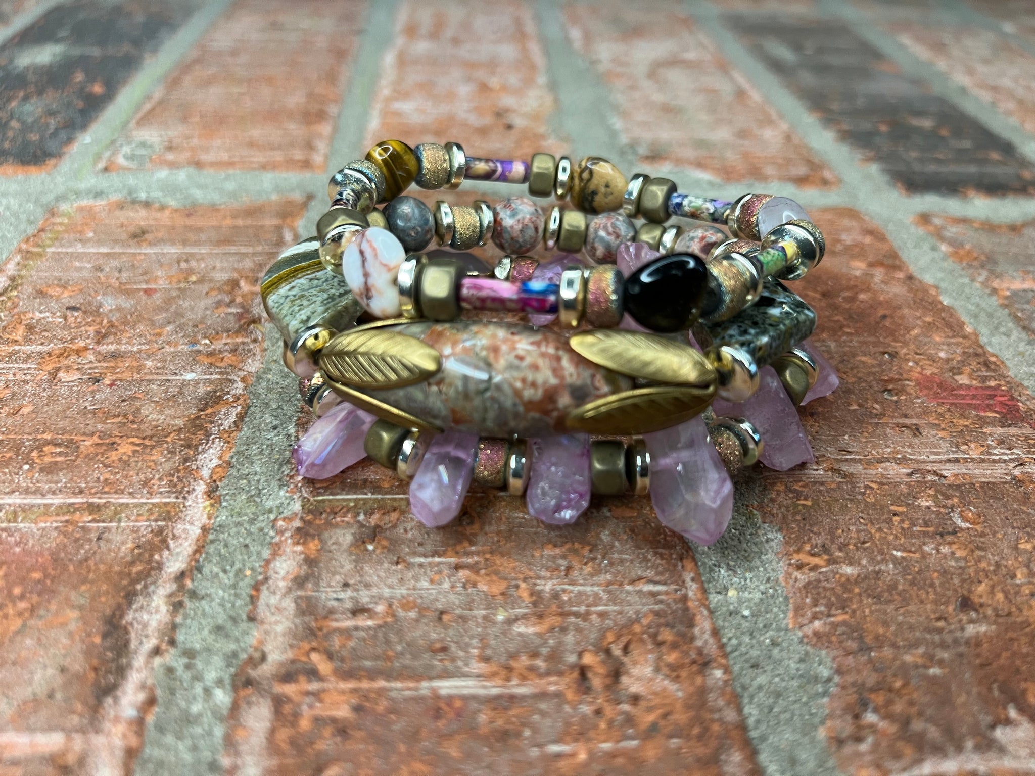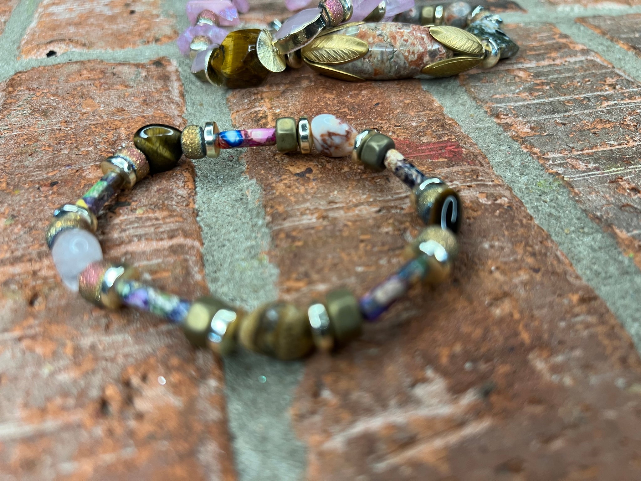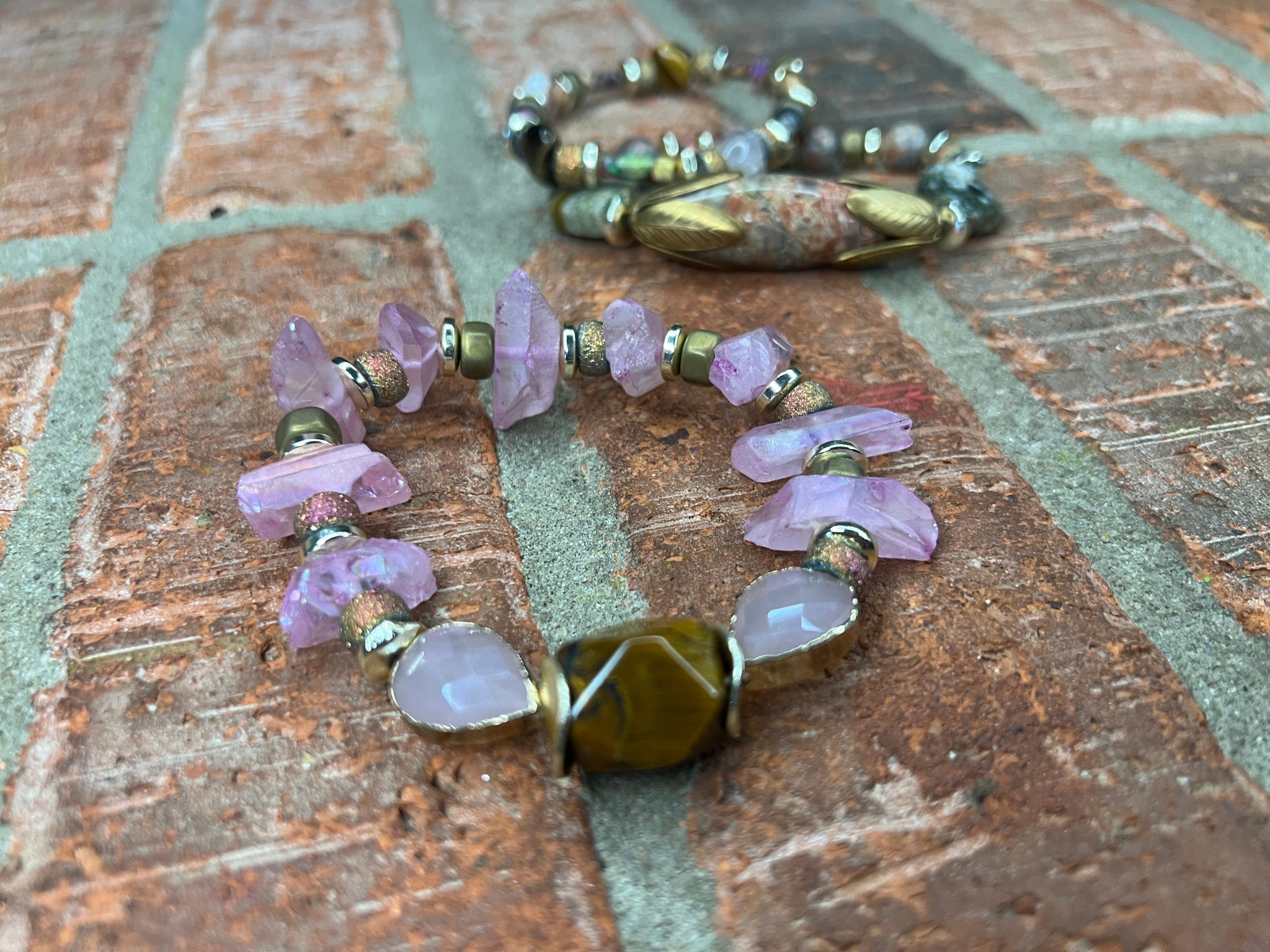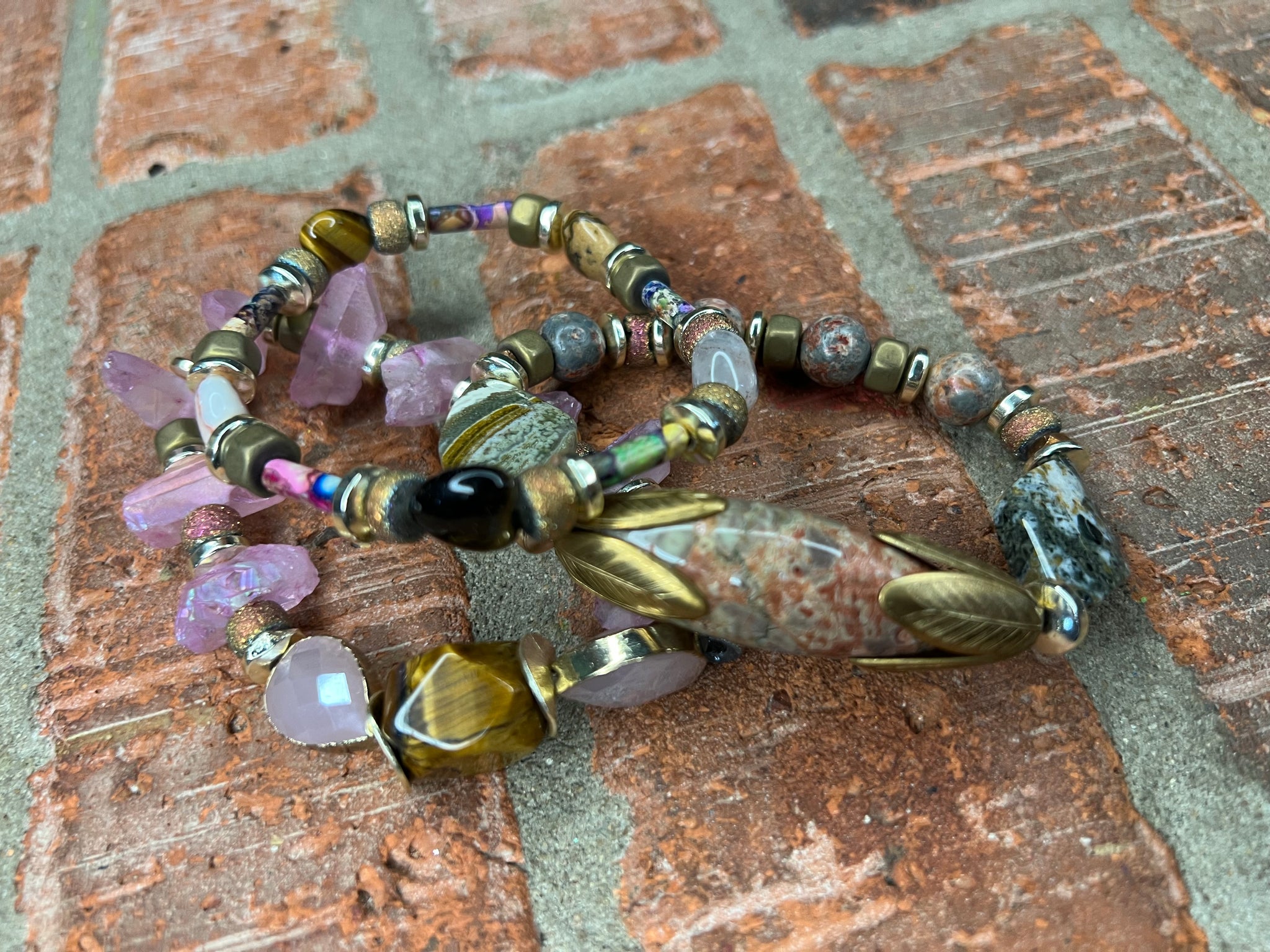 Hand-assembled with an eclectic blend of natural stones, this set features luminous rose quartz, grounding tiger’s eye, and richly patterned natural minerals layered with metallic accents. Raw pink crystal formations introduce organic texture, while polished gemstones capture and reflect light with every movement.