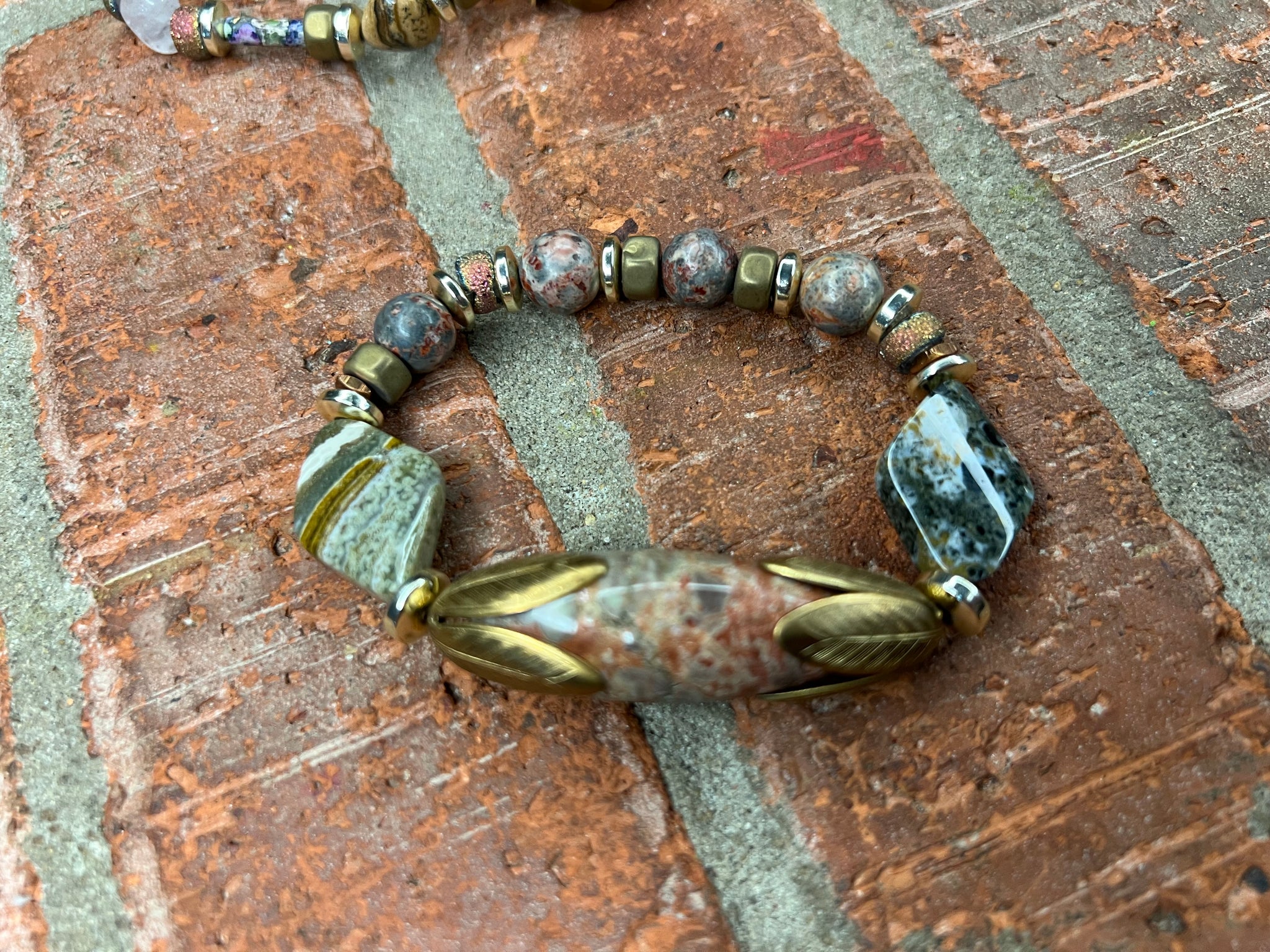 At the center of the design, an earthy statement stone framed in sculptural gold-toned metal anchors the set with a sense of strength and individuality. The layered composition allows each bracelet to stand beautifully on its own or combine into a powerful stacked statement.