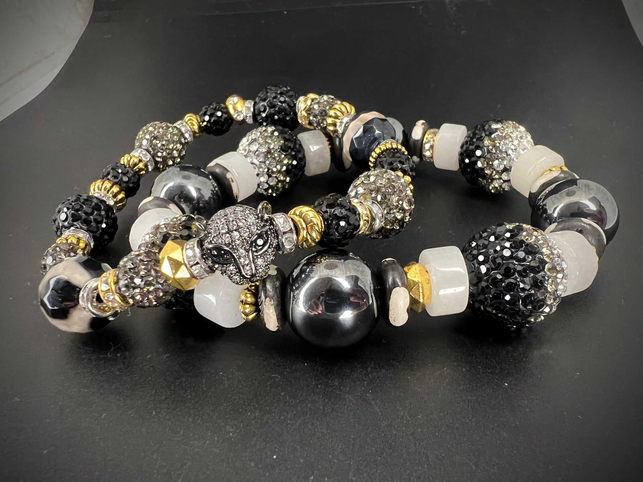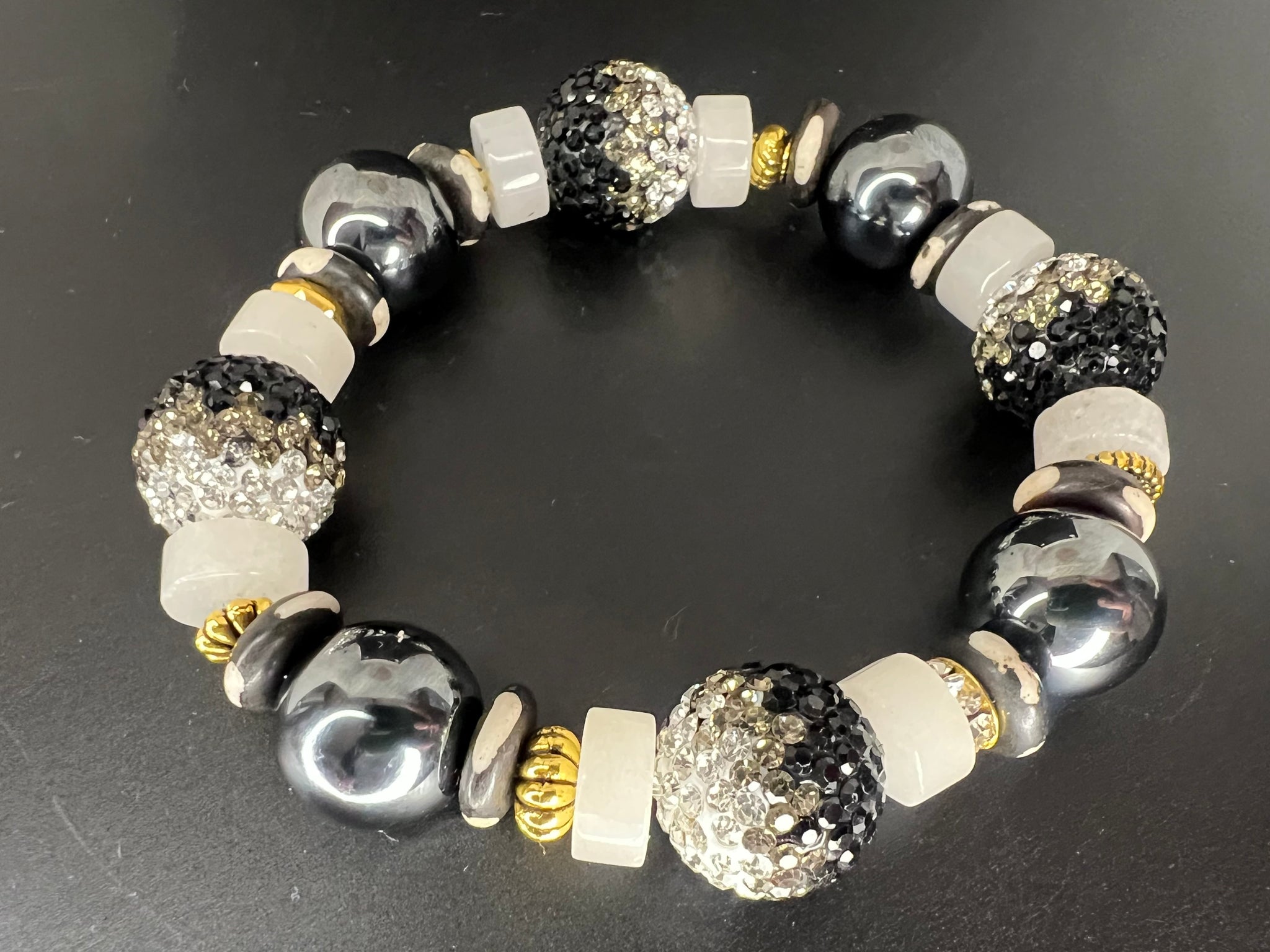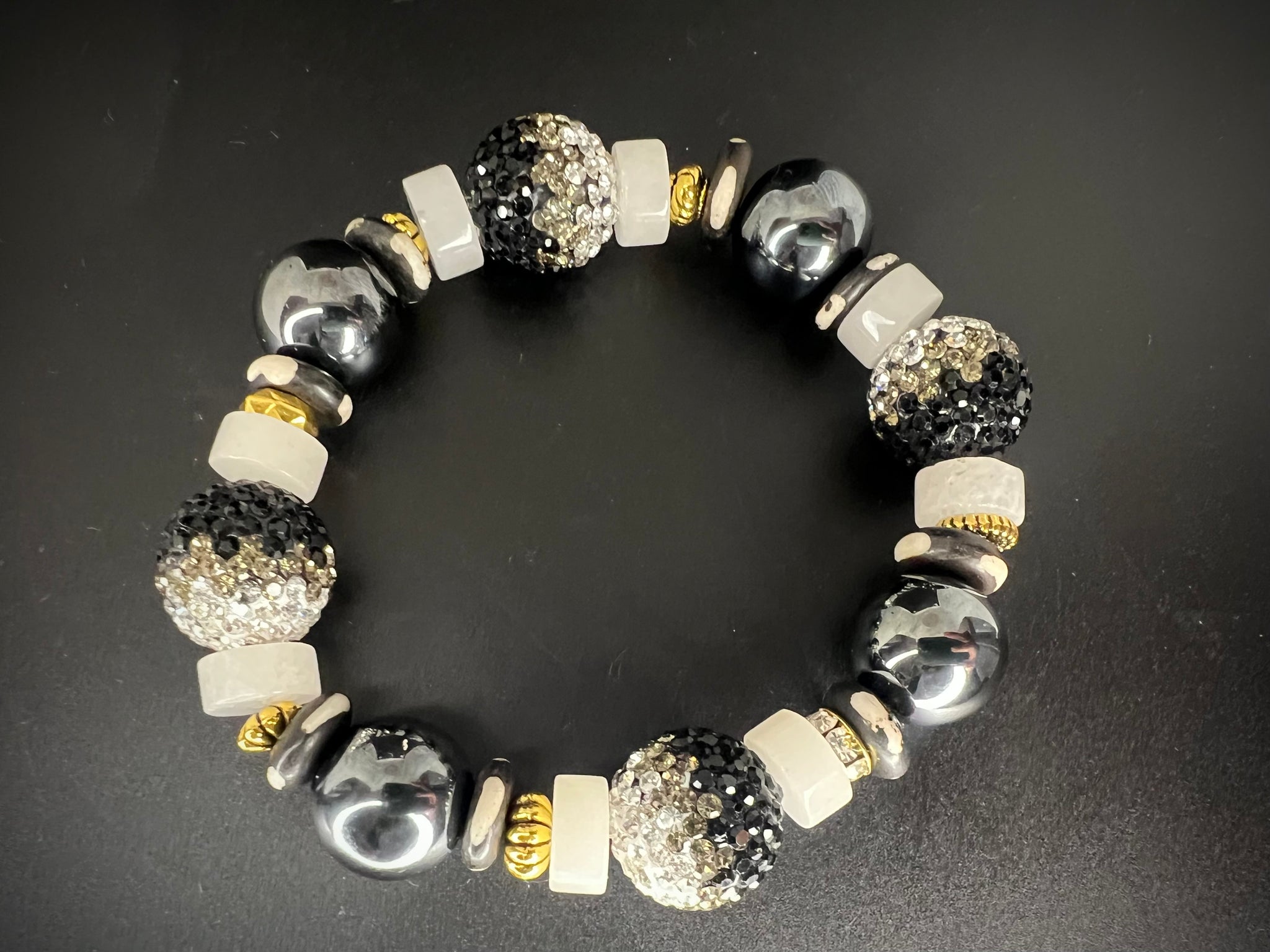 A bold fusion of matte blacks, metallic hematite, and crystal-studded spheres, Midnight Dominion delivers commanding elegance. This bracelet blends rugged texture with luxe shine, creating a powerful statement piece for the man who owns every room he steps into.
